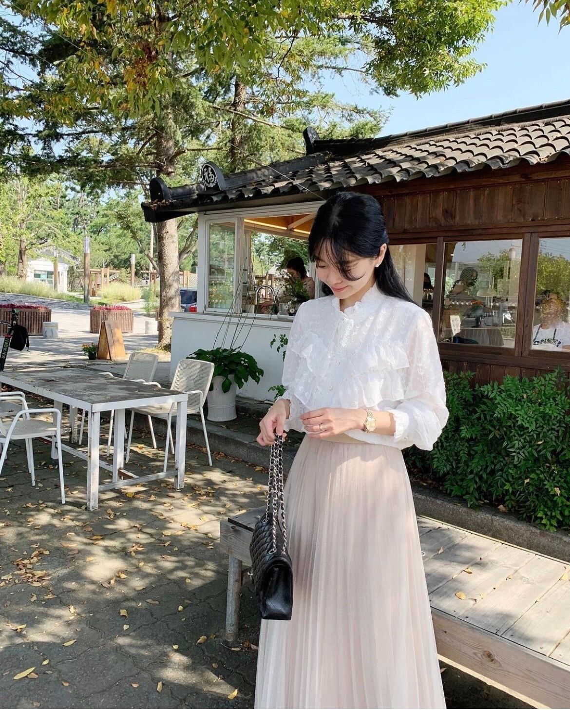 【韓国ファッション】大人可愛い ラウンドネックラッフル刺繍ルーズスリーブTシャツ シャツ ハイウェストウェストメッシュスカート Oネック ステッチ ♡ 韓国60303066096 | パリジェンヌ、韓国系ファッション July