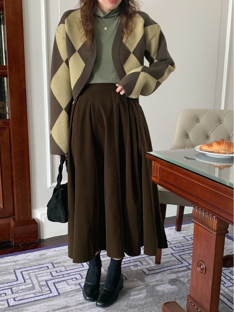 色:コーヒー色のスカート,黒スカート,黒いセーター,緑のセーター