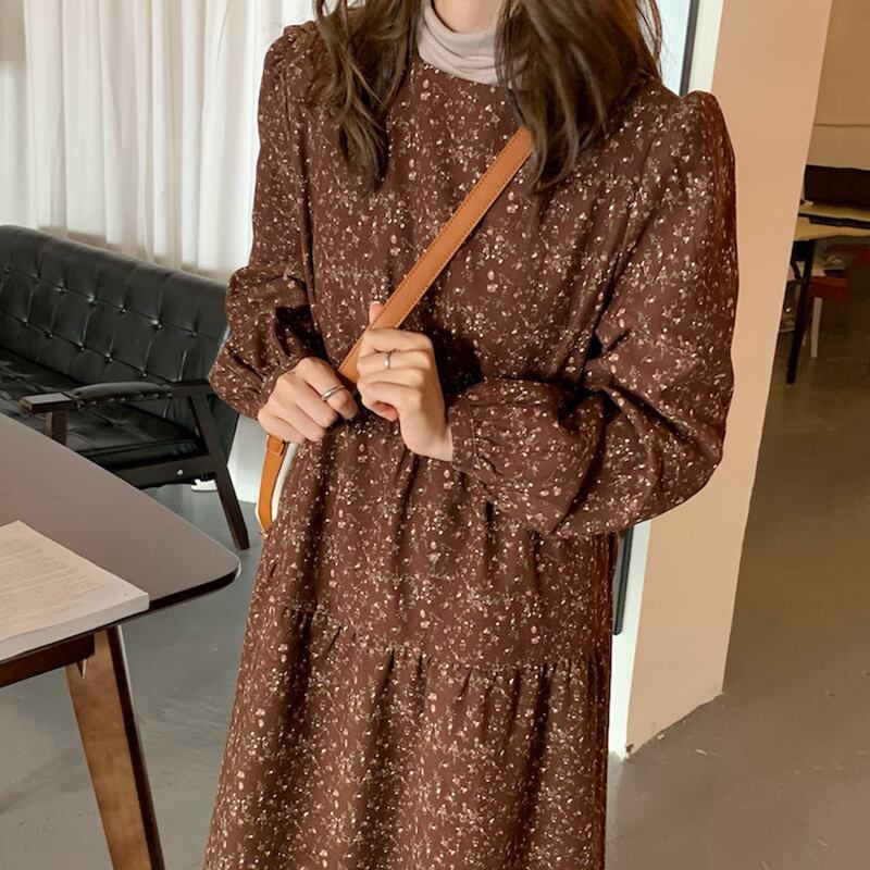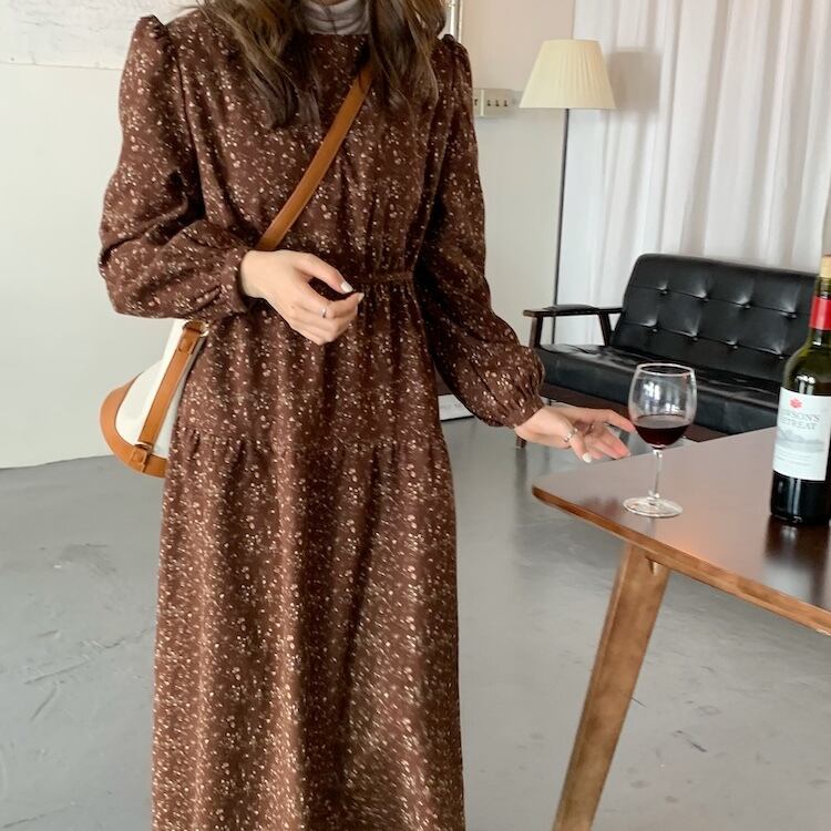 【韓国ファッション】大人可愛い オータムウィンタースタンダードラウンドネックプリーツウェストフローラルスリーブドレス レトロ 秋物 冬物 花柄 Oネック ♡ 韓国20101717995 | パリジェンヌ、韓国系ファッション July