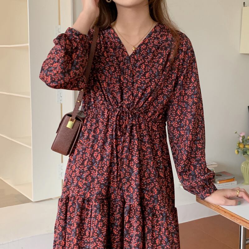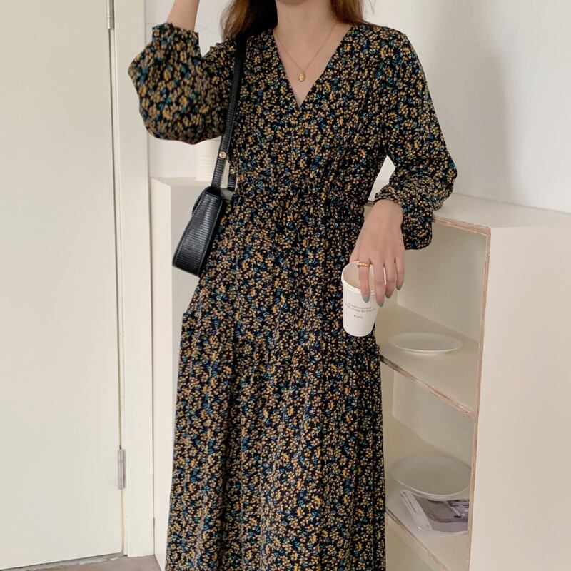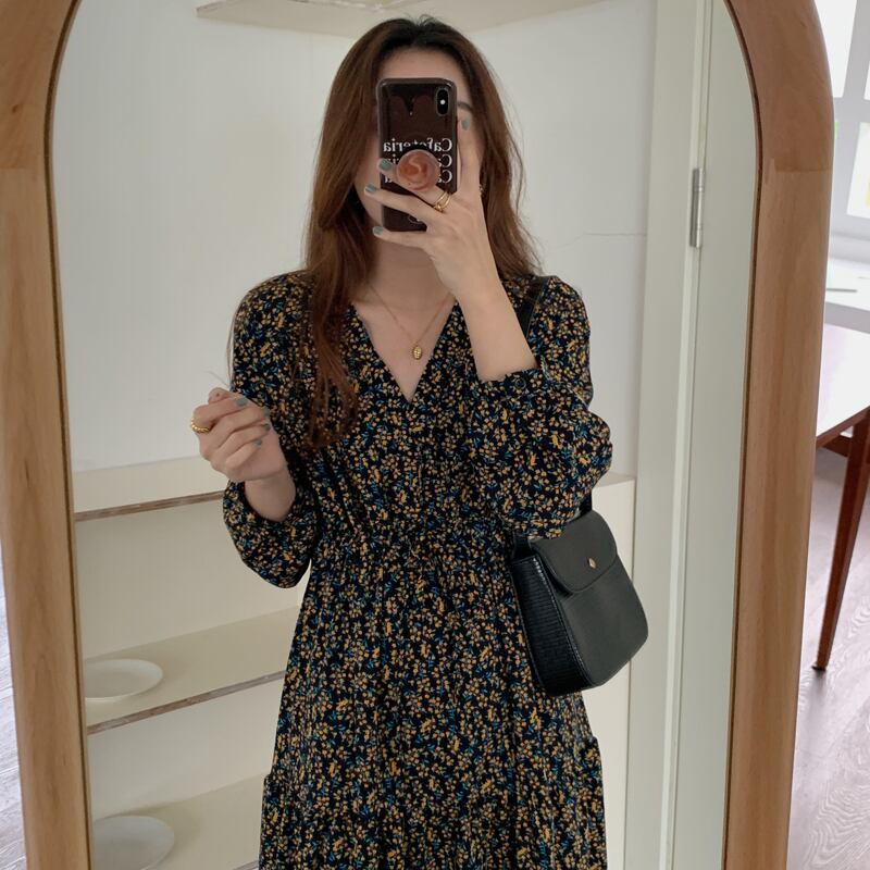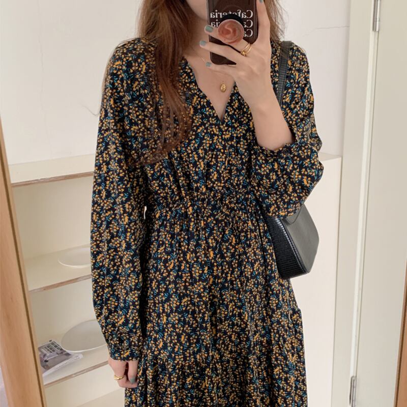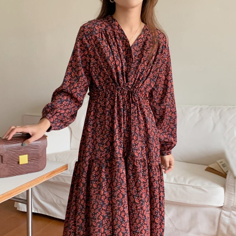 【韓国ファッション】大人可愛い オータムスタイル薄手Vネックプリーツギャザーウェストロングフローラルスリーブドレス 秋物 花柄 ♡ 韓国55684831558 | パリジェンヌ、韓国系ファッション July