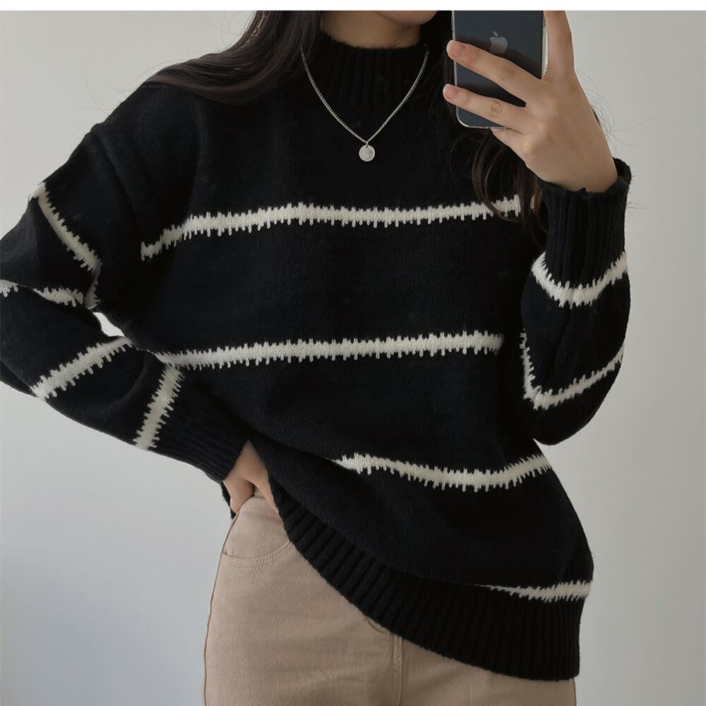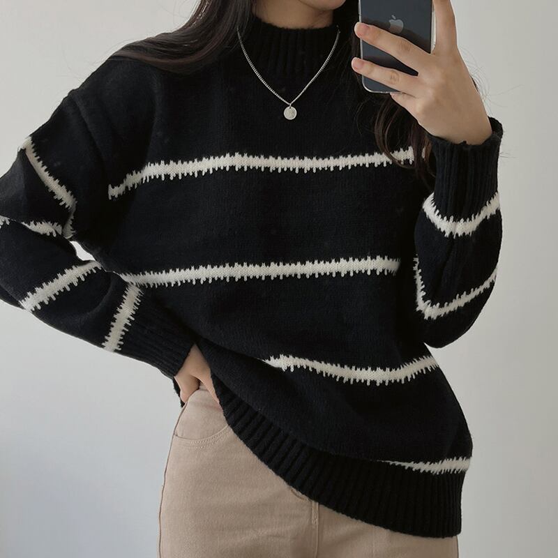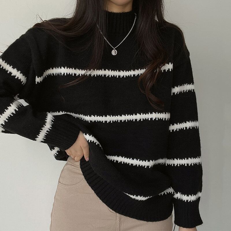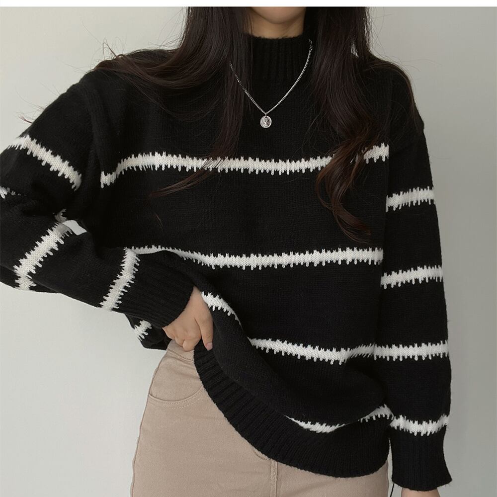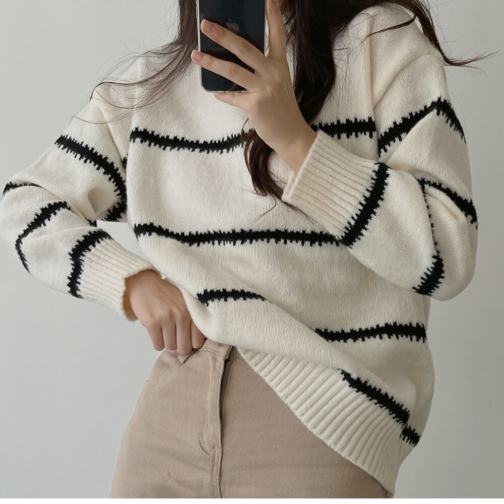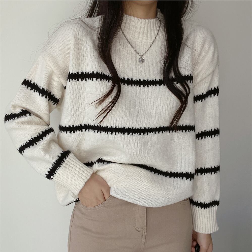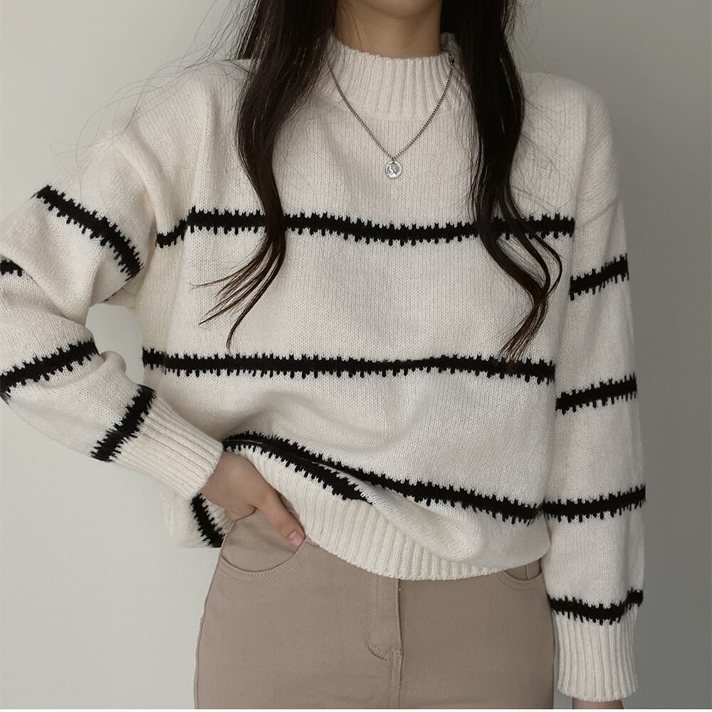 【韓国ファッション】大人可愛い オータムラウンドネックプルオーバー カラーストライプルーズニットセーター レディース ロング 秋物 Oネック ♡ 韓国6811186470 | パリジェンヌ、韓国系ファッション July