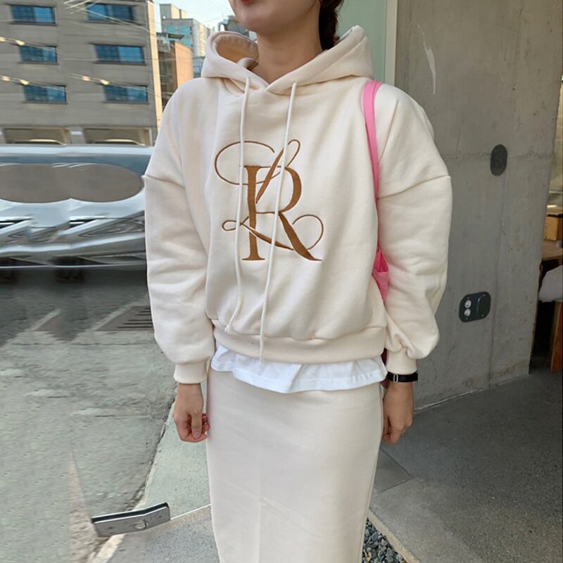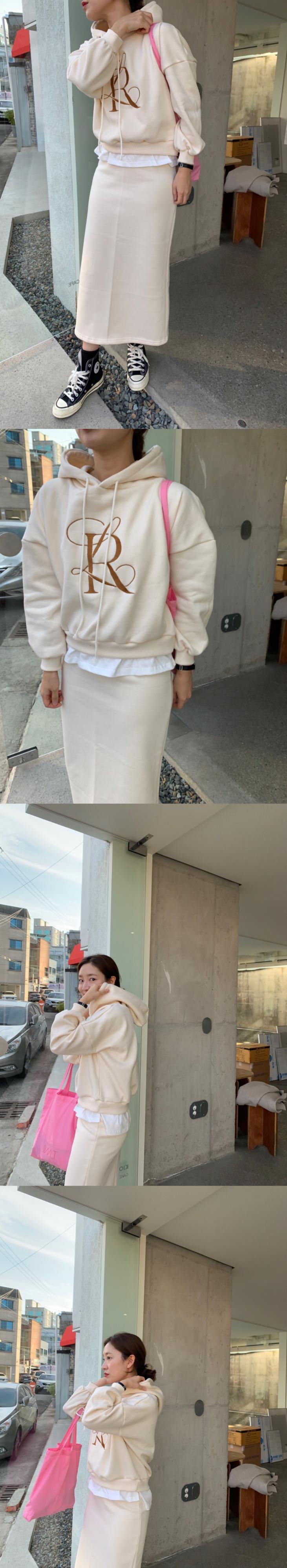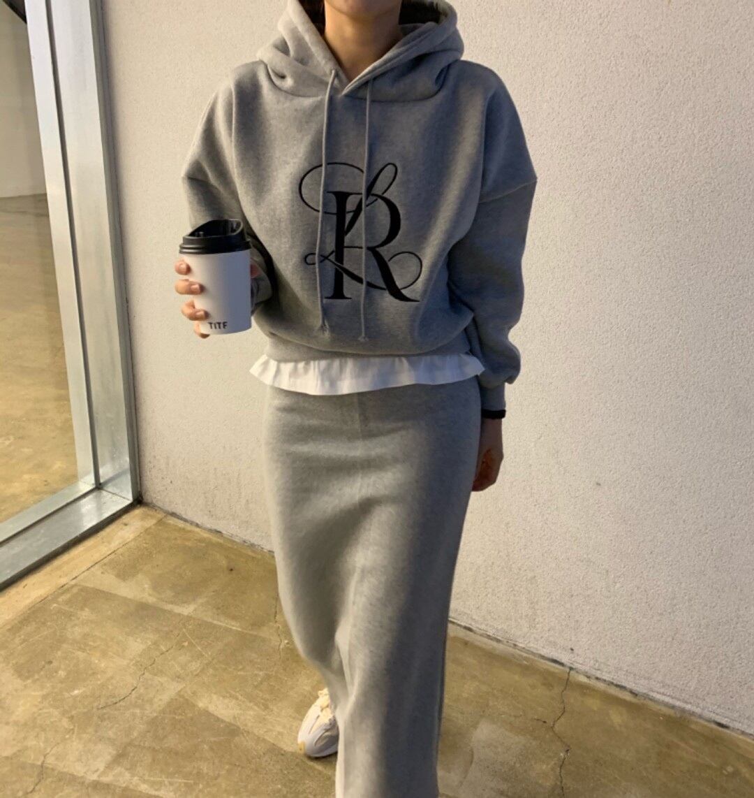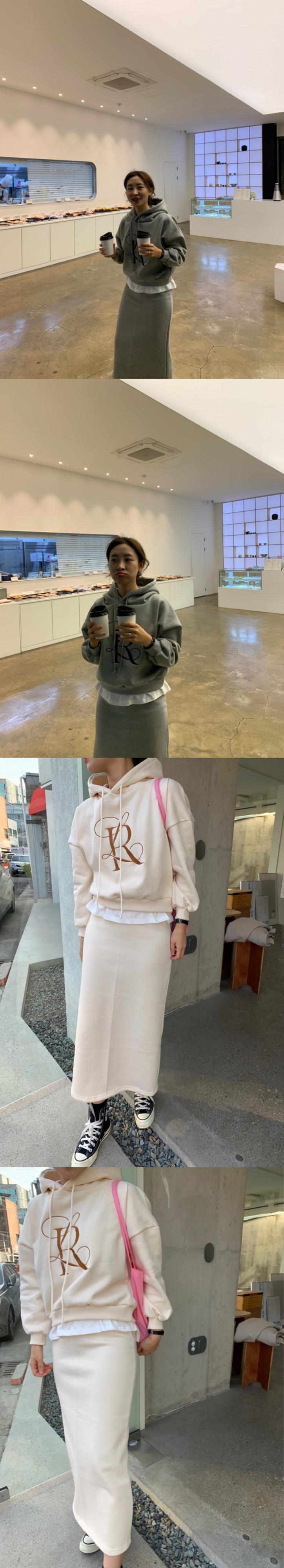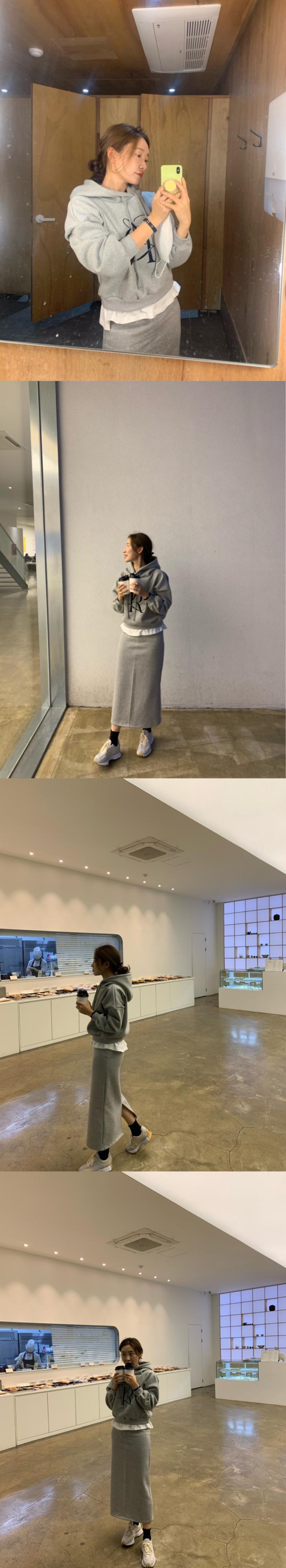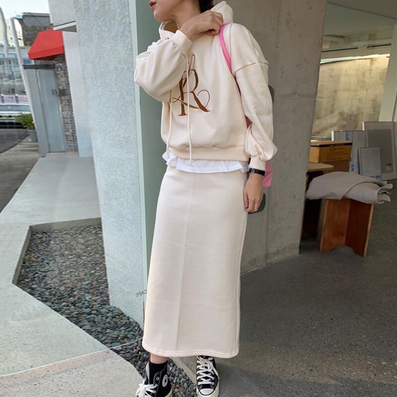 色:アプリコットセーター,アプリコットスカート,グレースカート,グレーの厚手のコットンT