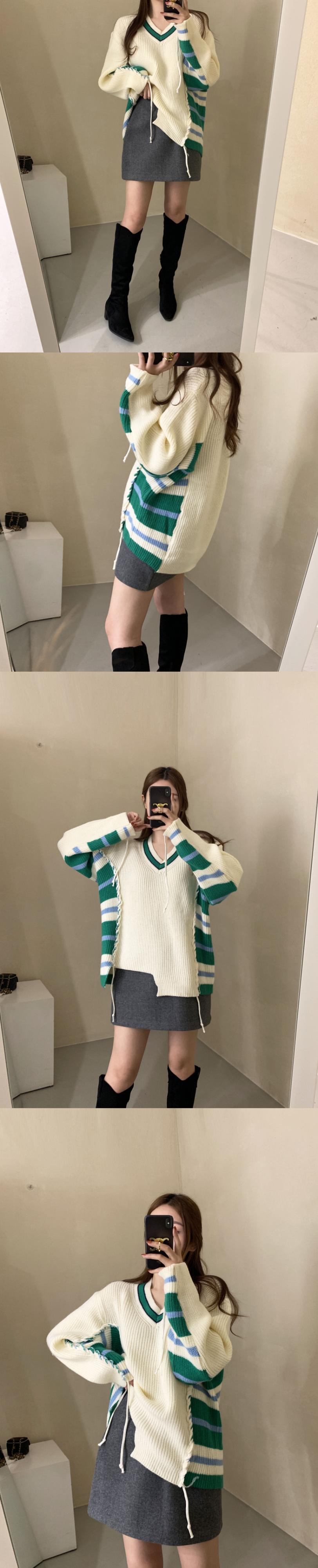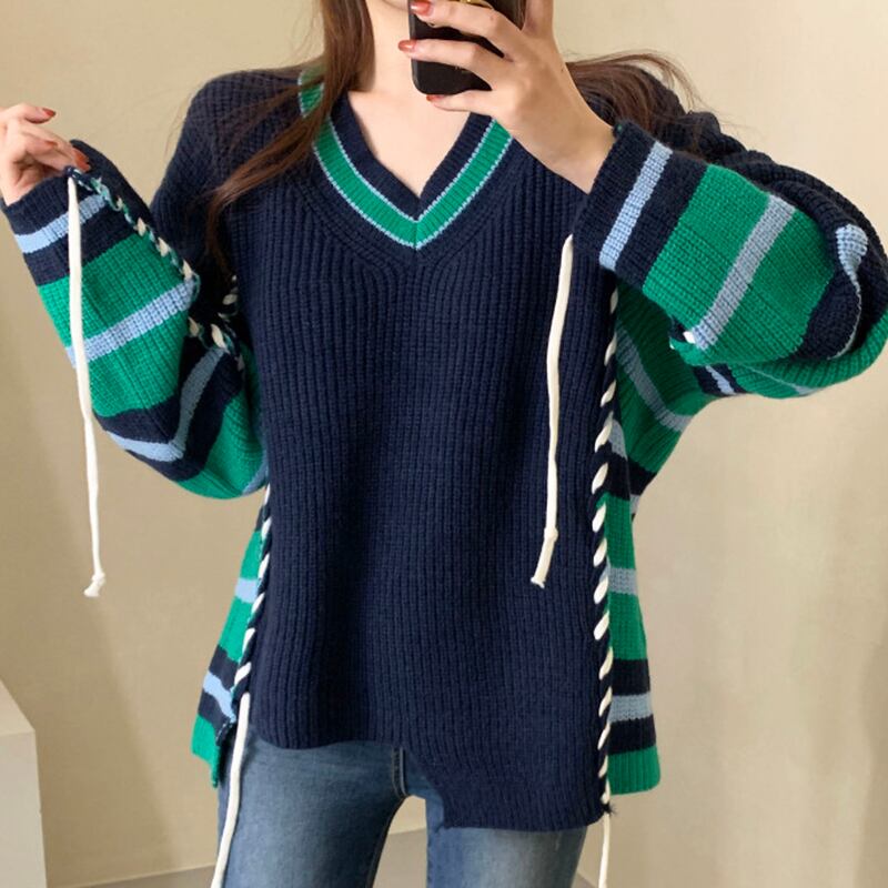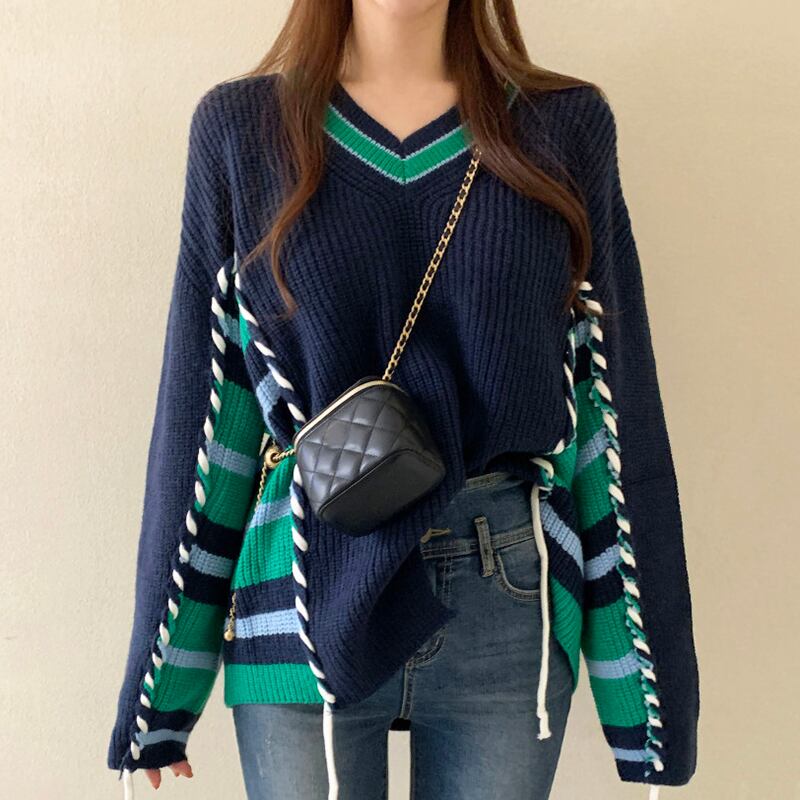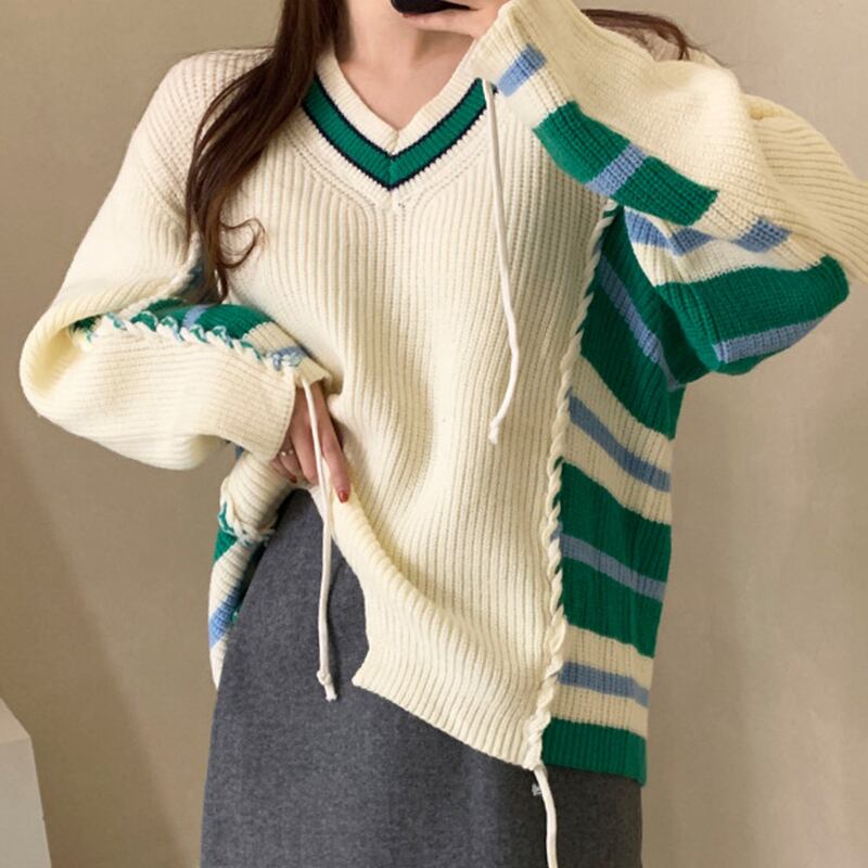 【韓国ファッション】大人可愛い オータムウィンターVネックニット ストライプカラールーズニットセーター レディース ロング 秋物 冬物 ♡ 韓国709445877 | パリジェンヌ、韓国系ファッション July