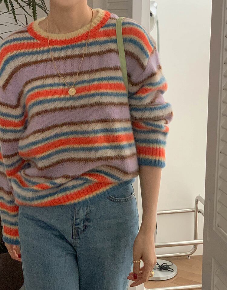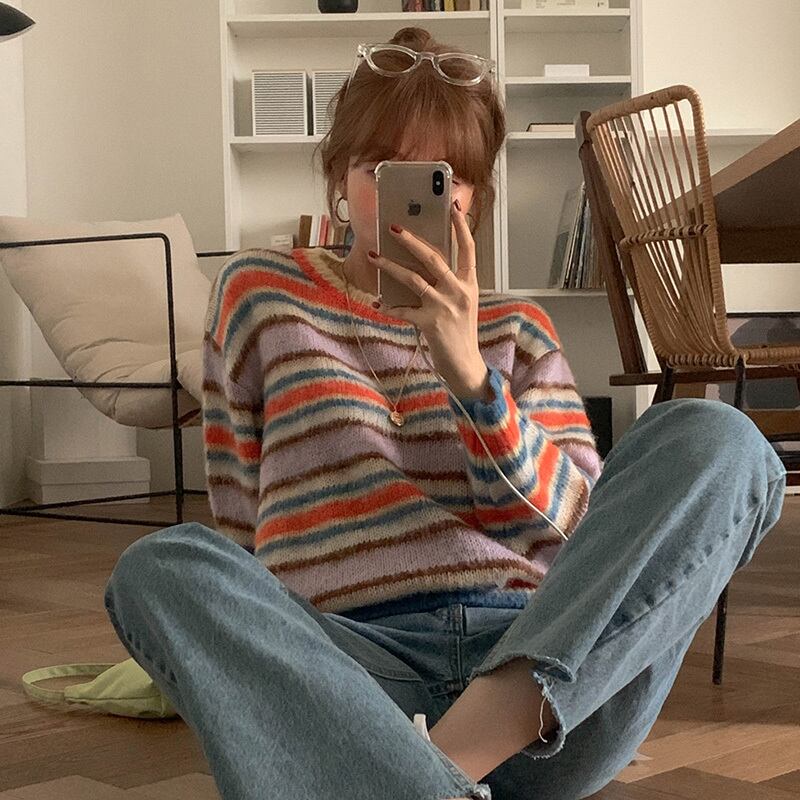 韓国服 オータムウィンタールーズスタンダードカラーストライプラウンドネックセーター レディース レトロ 秋物 冬物 Oネック ♡ nanfeng63791809800 | パリジェンヌ、韓国系ファッション July