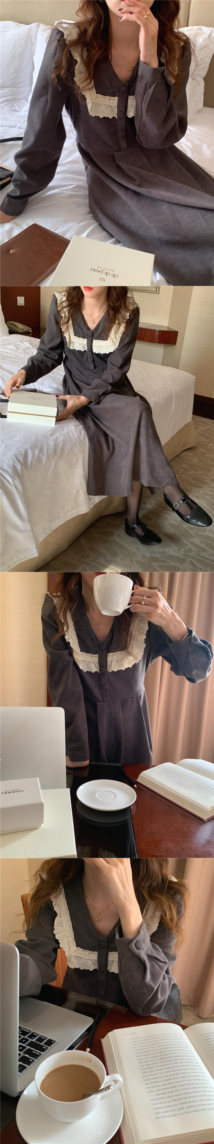 【韓国ファッション】大人可愛い スタンダードVネックレースプリーツウェストコーデュロイドレス レディース ロング レトロ ステッチ ♡ 韓国39928196263 | パリジェンヌ、韓国系ファッション July
