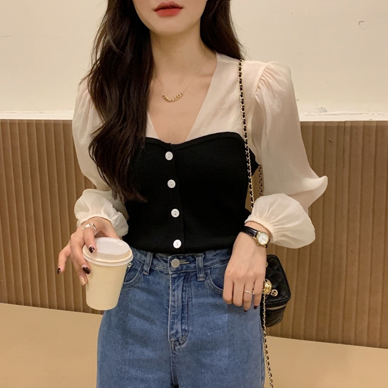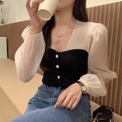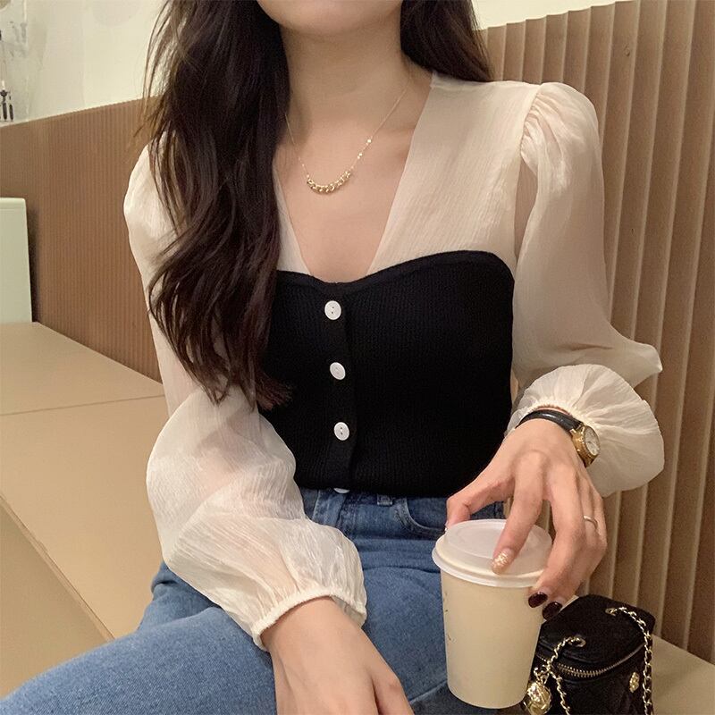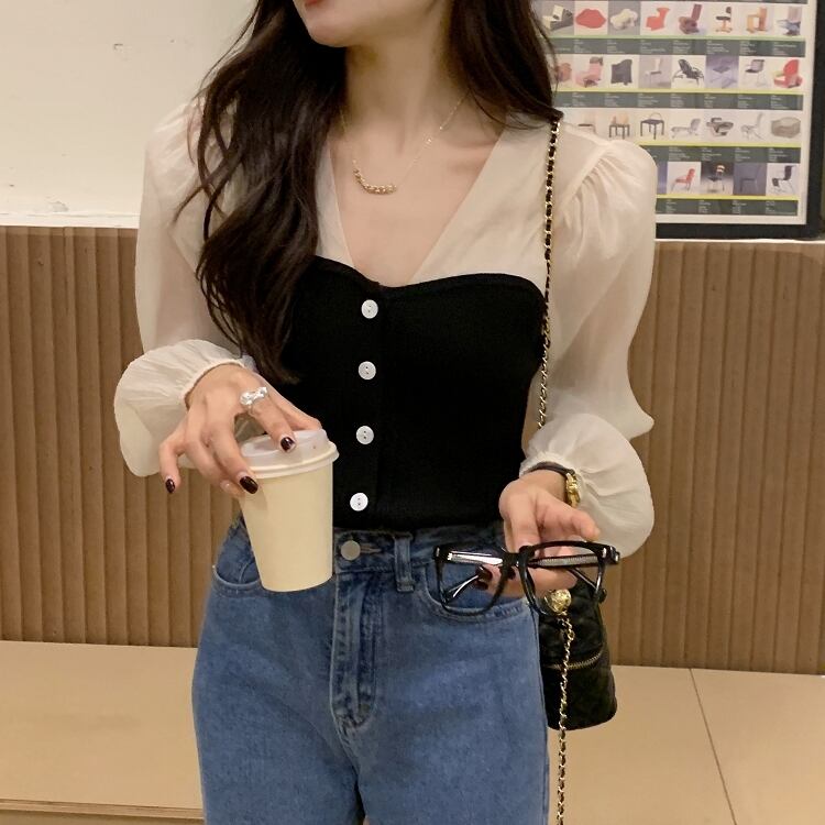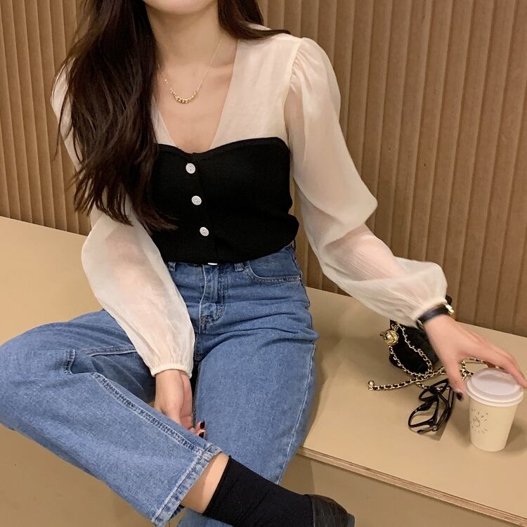 韓国服 オータムスタイルVネックメッシュニットスリーブシャツ 大人ガーリー スウィート キュート カジュアル 秋物 ステッチ ♡ nanfeng33393306341 | パリジェンヌ、韓国系ファッション July