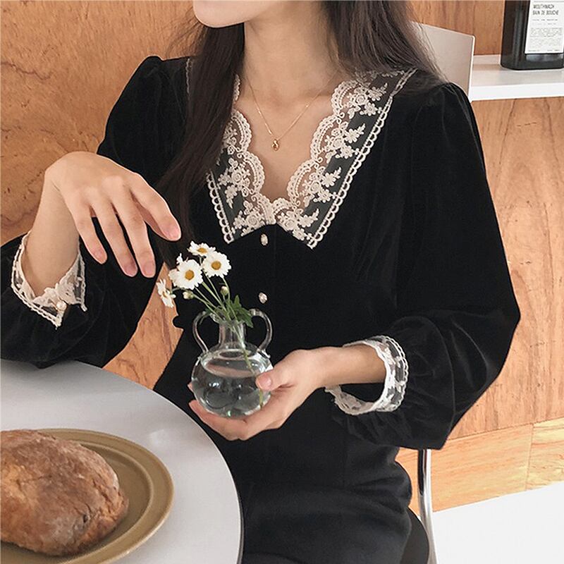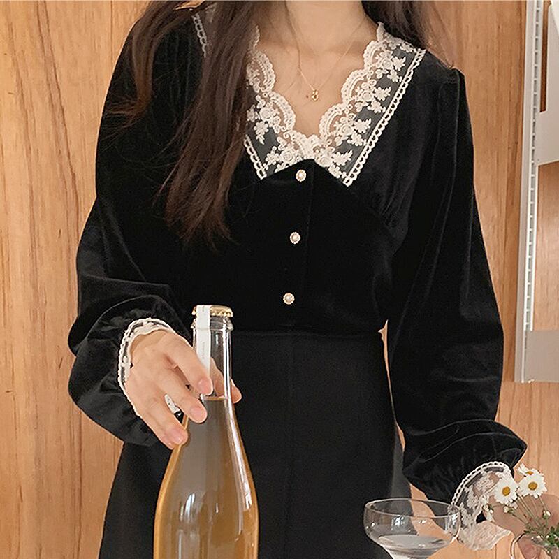 【韓国ファッション】大人可愛い オータムウィンターVネックレースパールボタンルーズスリーブベルベットシャツ 秋物 冬物 真珠 ステッチ ♡ 韓国1087713654 | パリジェンヌ、韓国系ファッション July