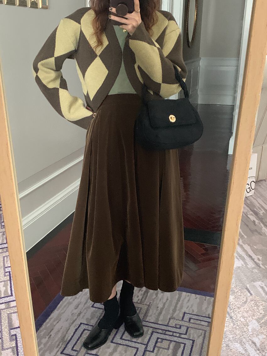 【韓国ファッション】大人可愛い スタンダードVネックカラーニットカーディガンセーター プリーツハイウェストベルベットスカート レトロ ♡ 韓国72612755707 | パリジェンヌ、韓国系ファッション July
