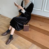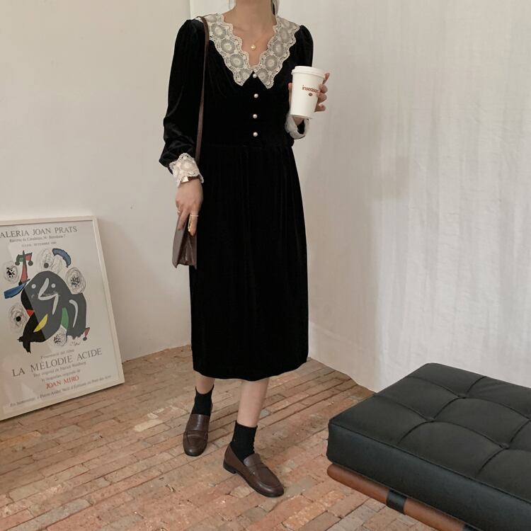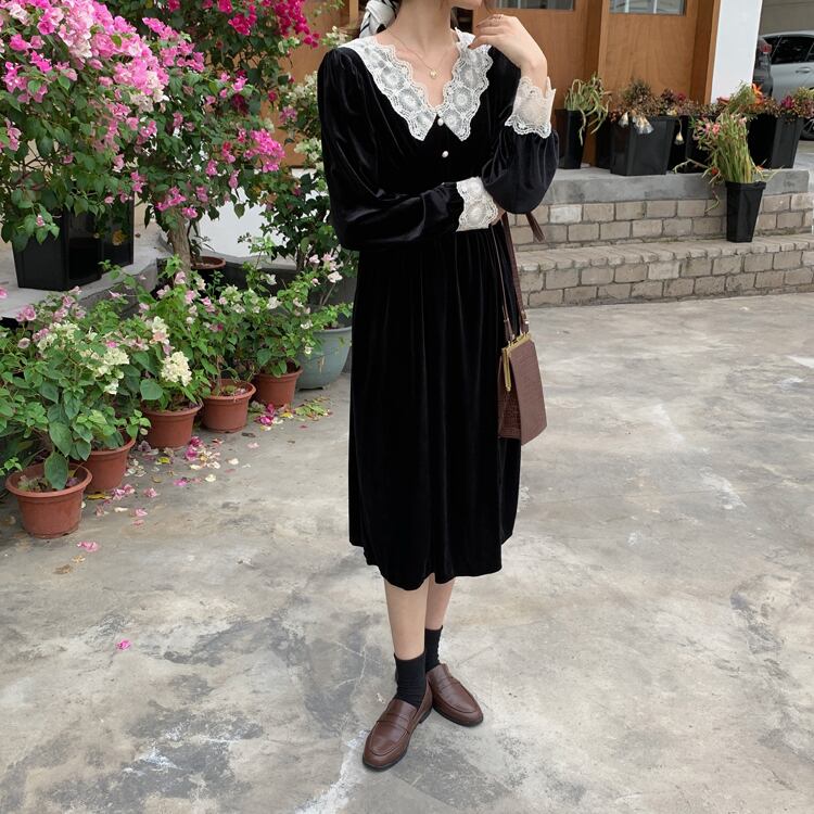 【韓国ファッション】大人可愛い オータムウィンターVネックレースハイウェストウェストパールボタンベルベットドレス 秋物 冬物 真珠 ステッチ ♡ 韓国93410075432 | パリジェンヌ、韓国系ファッション July