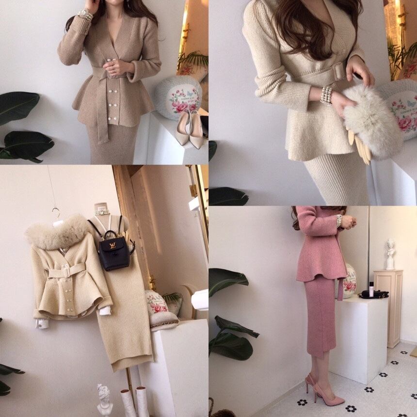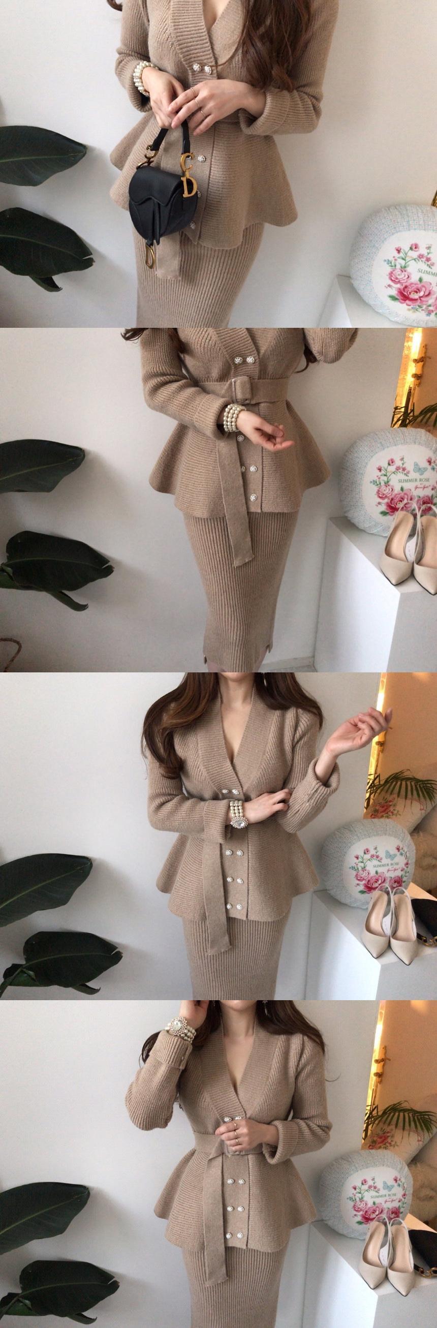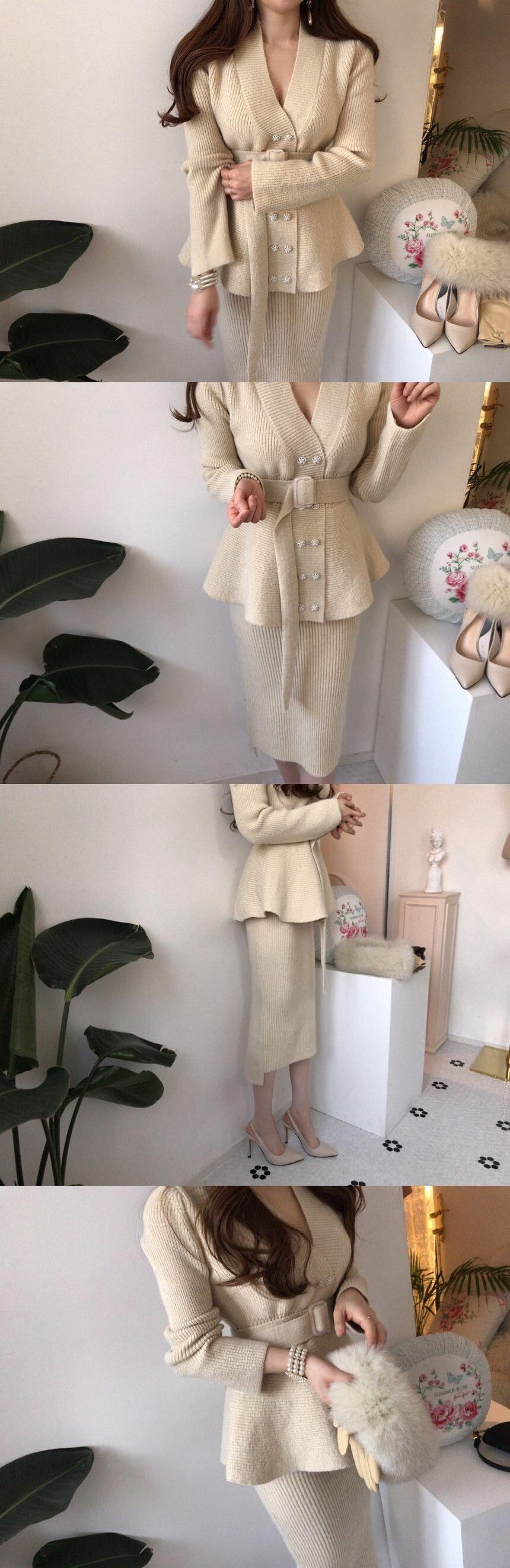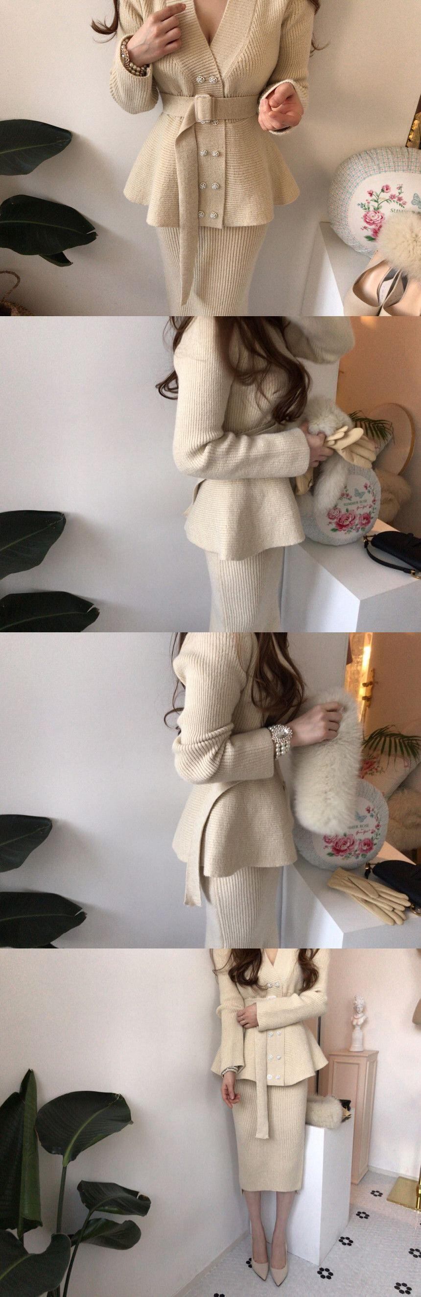 【韓国ファッション】大人可愛い Vネックパールダブルブレストセーター コート ハイウェストウェストアームスカート ニット レース レースアップ 真珠 ♡ 韓国6480155211 | パリジェンヌ、韓国系ファッション July