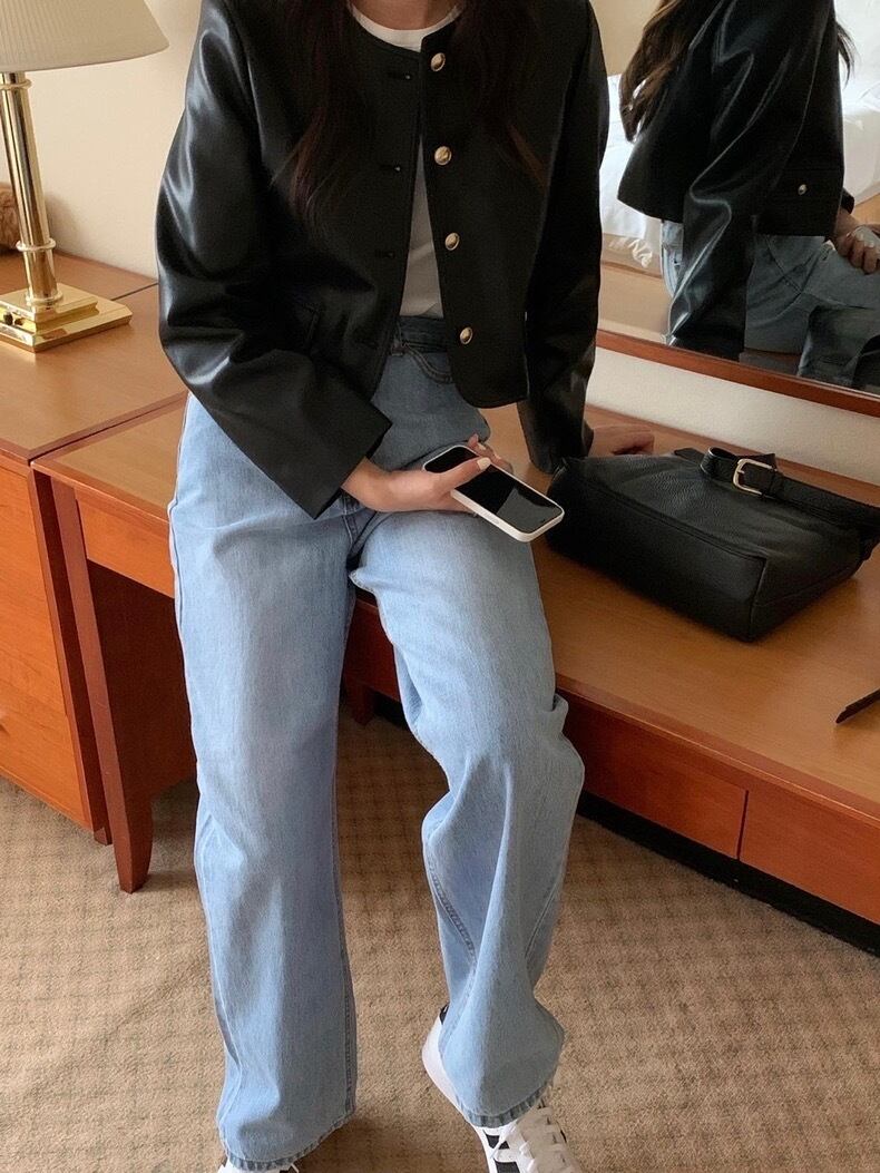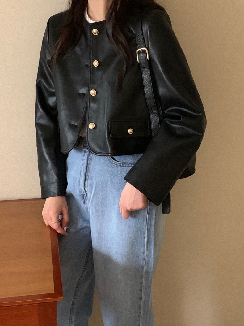 フォーマルもカジュアルにも着れる丸襟フェイクレザージャケット。