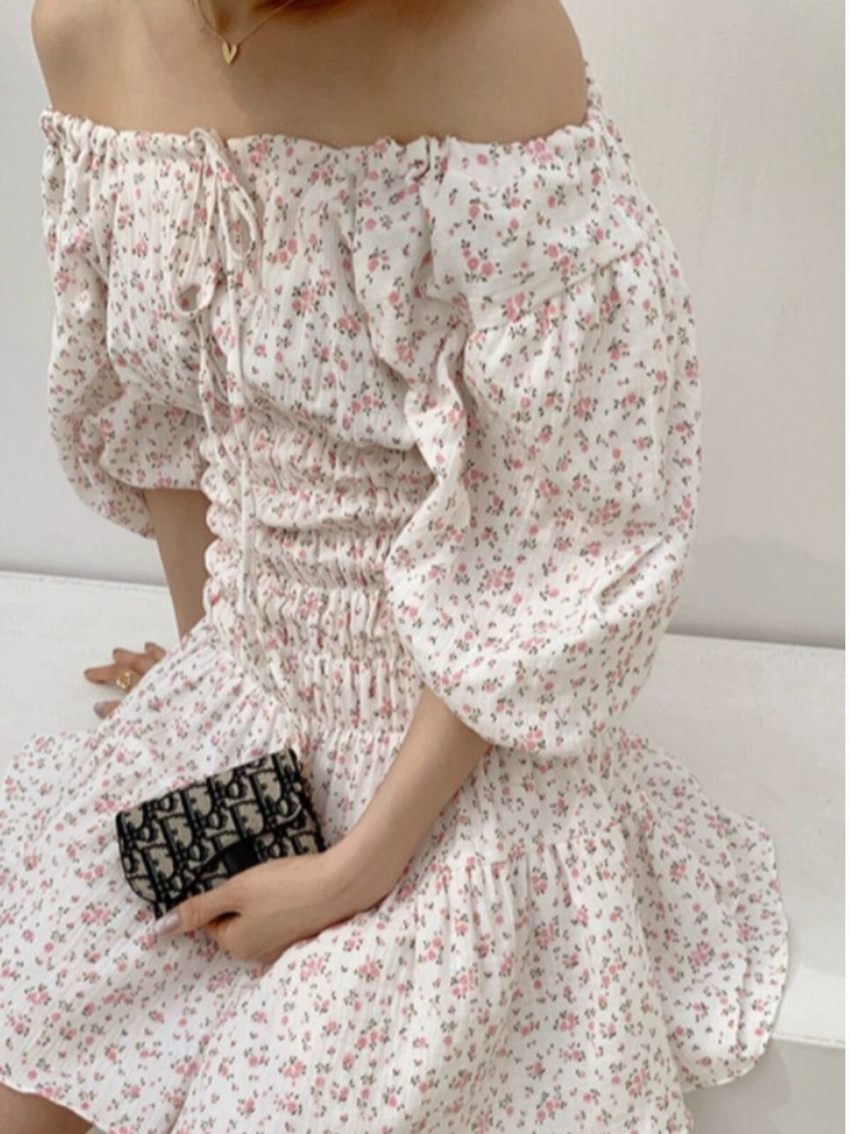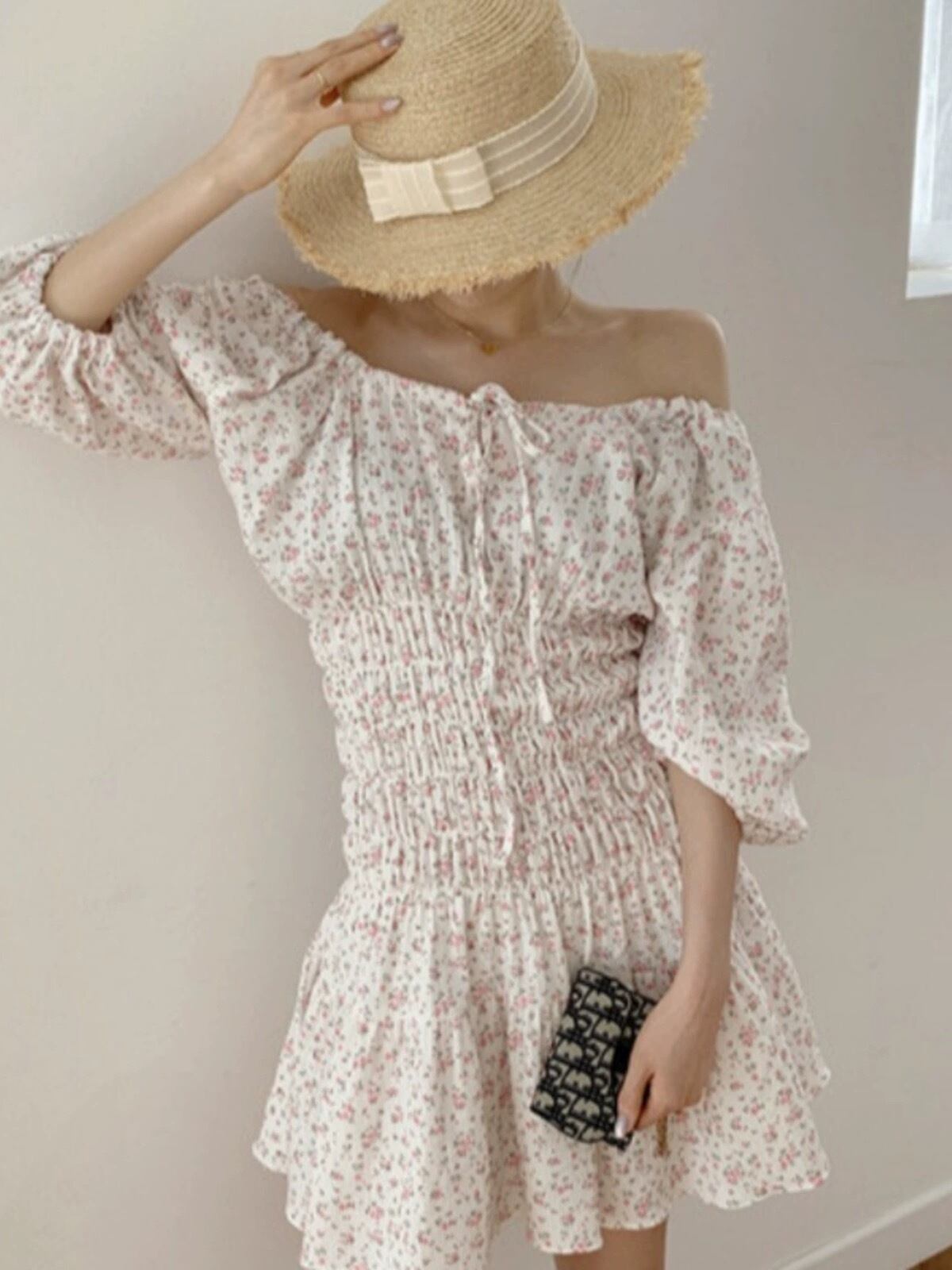 July シャーリング花柄ミニワンピース オフショルダーワンピース デザイナーズファッション 2024春服 個性的 オシャレ 韓国系ファッション 流行り レディースファッション july24042302 | パリジェンヌ、韓国系ファッション July